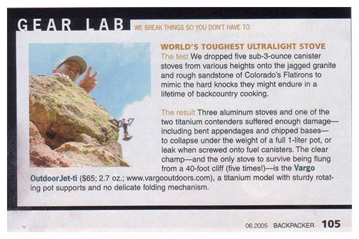 As seen in the photo to the left, in 2005, Backpacker Magazine named the original Jet-Ti stove the “World’s Toughest Ultralight Stove.” During their testing, they subjected five different stoves to an extreme durability test—throwing them off a cliff in Colorado, onto hard granite rock. After just one throw, every stove was rendered unusable—except for the Jet-Ti. In fact, after five more throws, it remained fully functional. This exceptional durability can be attributed to the Jet-Ti’s geometric shape and minimal moving parts, which allow it to withstand extreme conditions. Now, the twenty-year anniversary edition of the Jet-Ti stove carries forward all the rugged features that made the original so tough, with even further advancements in weight reduction and stove performance.
